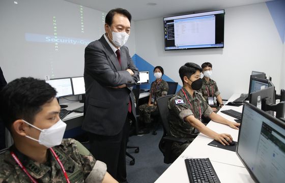 (성남=뉴스1) 안은나 기자 = 윤석열 대통령이 13일 경기 성남시 판교 제2테크노밸리 기업지원 허브에서 제11회 정보보호의 날 기념식을 마친 후 실전형 사이버 훈련장을 찾아 사이버 침해 대응 훈련을 받고 있는 교육생을 격려하고 있다. (대통령실사진기자단) 2022.7.13/뉴스1 |