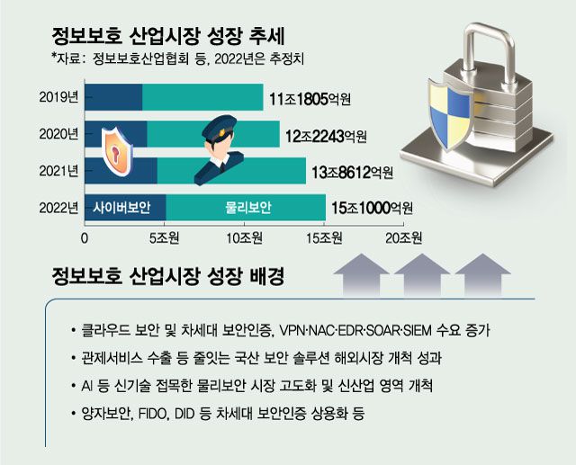 11일 과학기술정보통신부와 KISIA(정보보호산업협회) 등에 따르면 지난해 물리보안, 사이버보안 등 정보보호 업계의 산업 규모는 15조1000억원으로 전년(13조8612억원) 대비 9% 가량 늘어난 것으로 추정된다. 이 중 물리보안의 규모는 9조3114억원에서 10조원으로 늘어났다. 사이버보안 산업의 규모는 4조5497억원에서 5조1000억원선으로 13%가량 늘어나며 처음으로 5조원선을 돌파했다.