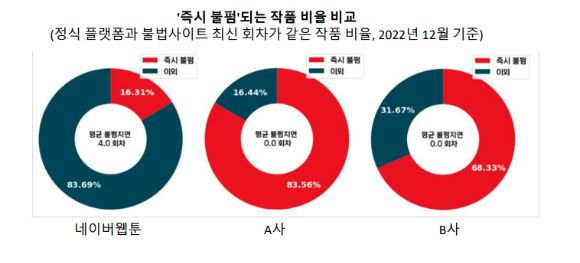 또한 불법 유통 사이트에 올라간 회차와 정식 사이트에 올라온 회차를 비교 분석한 결과, 최신 회차가 즉시 불법 유통되는 작품 비율이 네이버웹툰은 16.3%로 집계됐다. A사 83.6%, B사 68.3% 등 타사 대비 낮은 수치다.