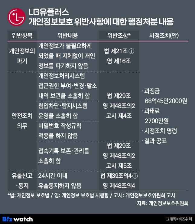 개인정보보호위원회는 LG유플러스에 대해 개인정보보호법 제21조 개인정보의 파기, 제20조 안전조치의무, 제39조의4 개인정보 유출 등의 통지·신고를 모두 위반했다고 보고, 과징금 68억원과 과태료 2700만원을 부과했다고 12일 밝혔다.