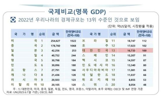 한국은행에 따르면 우리나라의 2022년 '명목 국내총생산(GDP)'는 1조 6733억 달러(추정)로, 전 세계 13위를 기록했습니다.