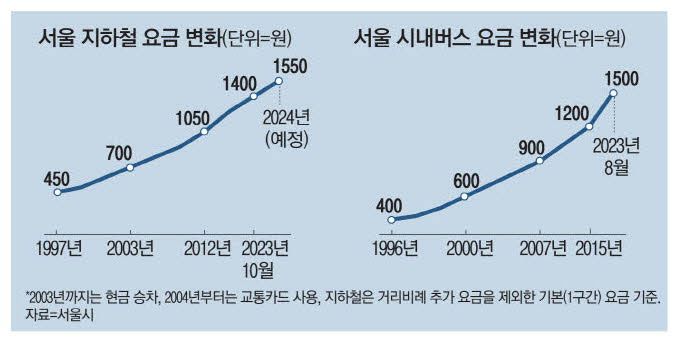 서울시에 따르면 지하철 요금의 경우 1998년 500원을 시작으로 1년에서 3년 주기로 매번 100원씩 인상돼왔다. 2007년에서 2012년까지의 5년간 요금이 동결된 바 있지만, 이 시기에는 2008년 금융위기가 겹쳐 공공요금 인상이 어려운 시기였다.