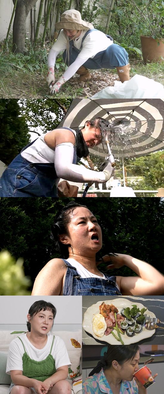 잡초와 한바탕 승부를 펼친 후 땀으로 흠뻑 젖은 박나래는 정원에 물을 주던 호스의 거센 물줄기와 정수리 정면 대결을 펼치는가 하면 셀프 찬물 등목까지, 거침없는 '쾌녀'의 면모를 뽐낸다. 그러면서 "여기도 풀(?)이 자라니까"라며 겨드랑이까지 오픈, 아낌없는 찬물 세례를 퍼붓는다.