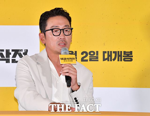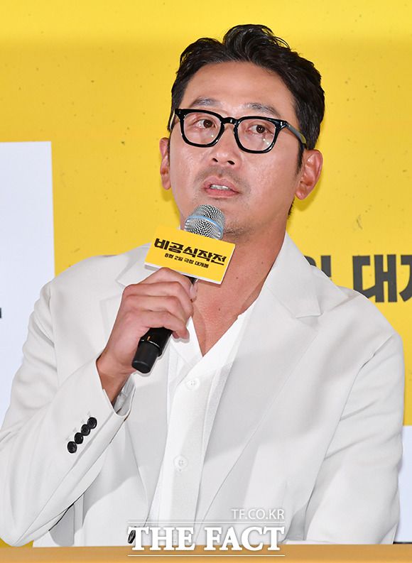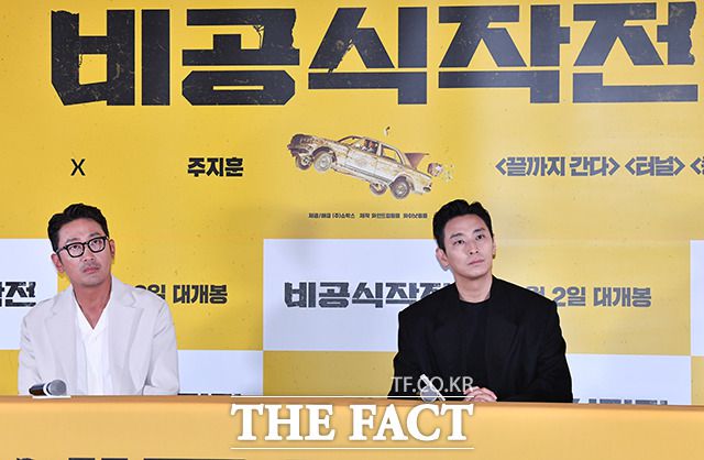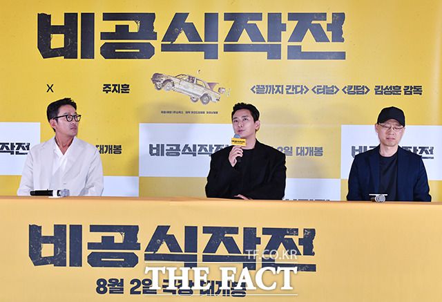 [더팩트ㅣ박헌우 기자] 배우 하정우와 주지훈, 김성훈 감독(왼쪽부터)이 13일 오후 서울 강남구 메가박스 코엑스에서 열린 영화 '비공식작전' 기자간담회에 참석하고 있다.