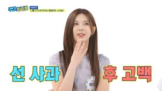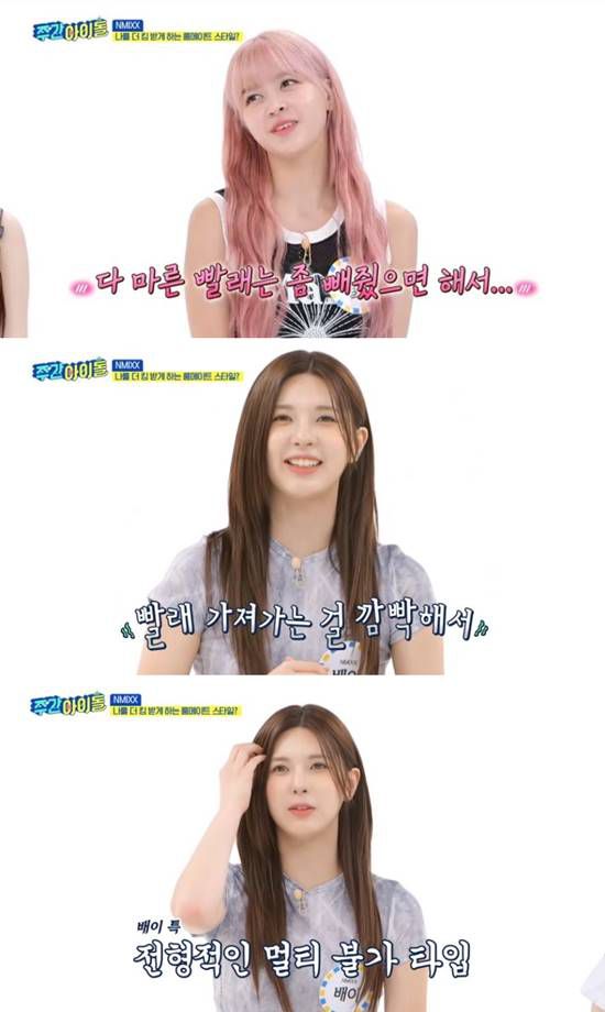 배이는 "빨래 가져가는 걸 깜빡한다. 그러다 보니 옷장의 옷은 점점 줄어들고 빨래는 주구장창 쌓이게 되더라"라고 솔직하게 말해 오히려 멤버들이 당황하게 만들었다.