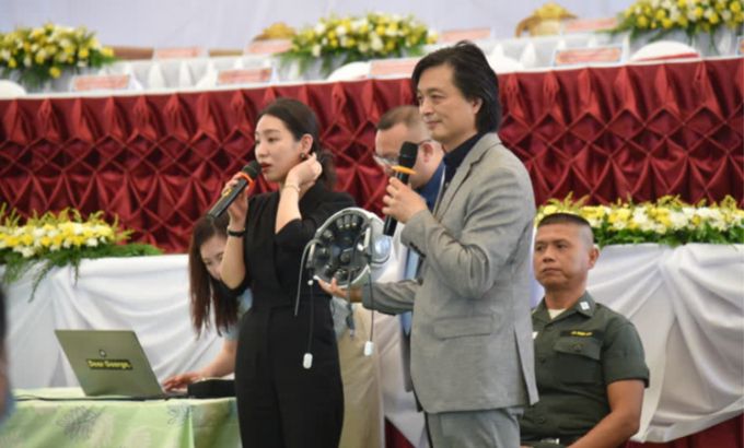 강승완 아이메디신 대표(사진 오른쪽)가 뇌파 측정 및 근적외선 케어 기기 'iSyncWave'를 태국 경찰청 등 마약 관련 정부 관계자들에게 소개 중이다/사진제공=아이메디신 |