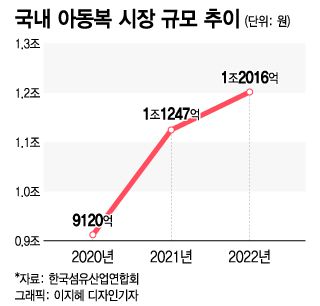 한편 국내외 출산율은 줄어드는 추세지만 자녀 의류 소비에 대한 욕구가 높아지면서 아동복 시장은 점차 확대되고 있다. 실제 전체 패션 시장이 2020년 40조3228억원에서 2022년 45조7789억원으로 14% 늘어날 때 유아동 패션 시장은 같은 기간 9120억원에서 1조2016억원으로 32% 늘었다. 관련 업계에서는 프리미엄 아동복을 중심으로 매출이 늘어난 것으로 본다. 올 초부터 아동복 시장에선 고가의 브랜드가 영유아를 타깃으로 한 컬렉션을 출시하는 등 명품 브랜드가 강세를 나타냈다.