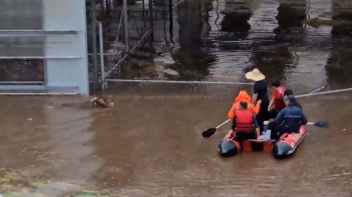 인근 치성천도 제방이 무너지면서 소 사육 농가가 물에 잠겨 119보트를 동원해 소 등을 대피시키고 있습니다.