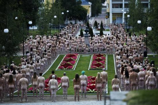 AFP통신에 따르면 15일(현지시간) 오전 3시쯤 핀란드에서 행위 예술가인 스펜서 튜닉과 자원자 1000명이 대규모 나체 사진 촬영을 진행했다. 자원자들은 공원과 호수를 오가며 튜닉의 지시에 따라 포즈를 취했다.