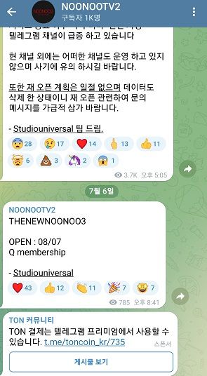 17일 업계에 따르면 '누누티비2'(NOONOOTV2) 타이틀을 달고 운영 중인 한 텔레그램 채널은 지난 6일 공지에서 '더 뉴 누누3'(THE NEW NOONOO3)를 8월 7일에 오픈한다고 밝혔다. 이 계정은 당초 누누티비 운영진인 '스튜디오유니버설'의 두 번째 계정으로 알려졌지만, 기존 누누티비 운영진과 동일 인물인지는 확인되지 않았다.