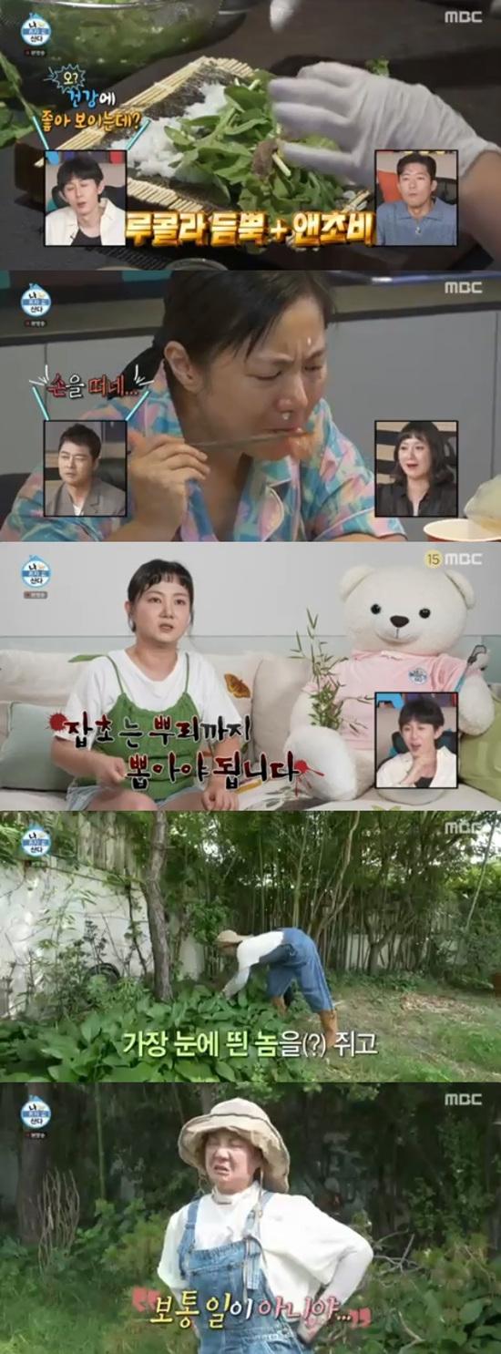 박나래는 만반의 준비를 하고 잡초 뽑기에 돌입했다. 땀을 뻘뻘 흘리던 박나래는 잠시 쉬기 위해 물 호스를 들고 화분에 물을 줬다. 박나래는 물 호스를 의자에 고정시켜놓은 뒤 다시 잡초를 뽑기 시작했다. 박나래는 "누구 하나 죽자 이런 마음으로 뿌리까지 뽑아야 한다"면서 나중에는 갈고리 도구까지 사용해 잡초를 뽑았다.