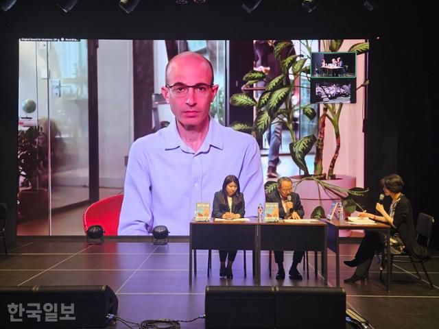 4월 19일 서울 종로구 노무현시민센터에서 영상을 통해 한국 기자와 대화하고 있는 역사학자 유발 하라리. 박상희 인턴기자 |
