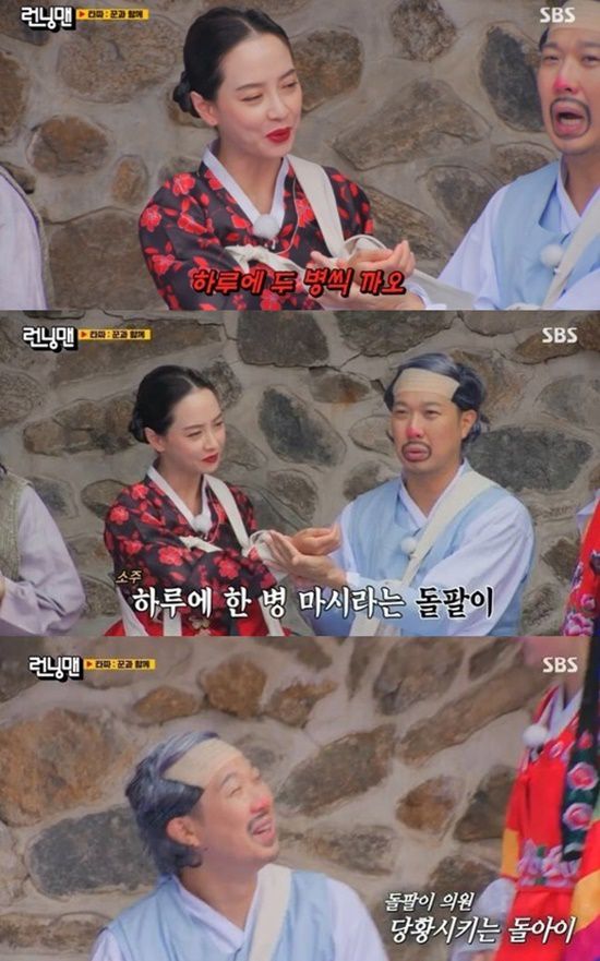 하하는 송지효에게 "죄송하지만 소주를 하루에 몇 병 까시오"라고 물었고, 송지효는 "하루에 두 병씩 까오"라고 너스레를 떨었다.