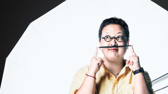 황웃는돌 작가는 "그럼에도 불구하고"라는 말을 자주 쓴다. 지난 14일 서울 상암동 중앙일보 스튜디오에서 인터뷰하며 연필과 함께 포즈를 취했다. 김경록 기자 |
