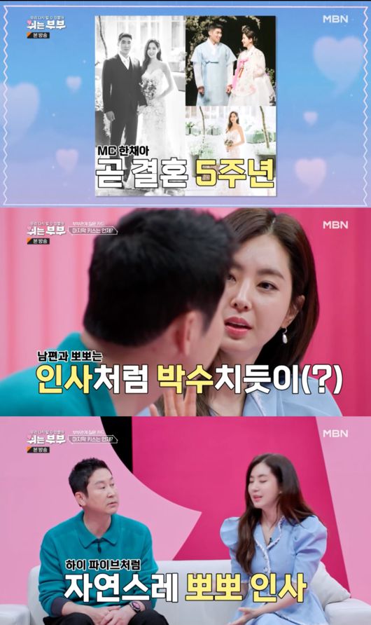 출연한 부부들이 마지막 키스에 대해 얘기를 나누자 한채아는 “나도 뽀뽀는 하고 싶어서 하는 것보다 의식처럼 인사처럼 박수치듯이 한다. ‘갔다 와’ 하면서 하이파이브처럼 인사 하듯이 한다. 한 번 정도 한다”며 웃었다.