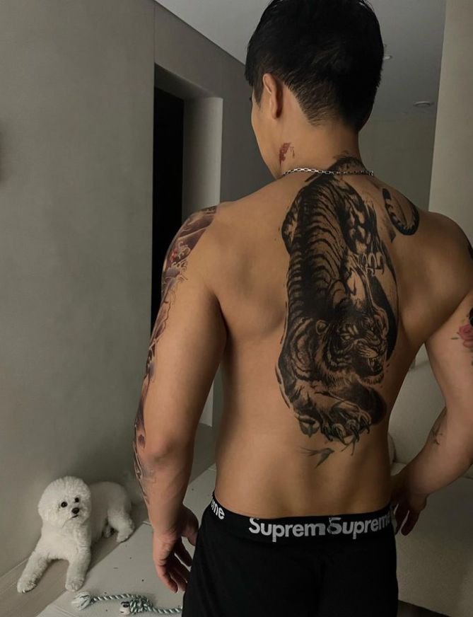 등쪽에는 포효하는 호랑이가 가슴에는 파도 위로 솟구치는 물고기들이 그려졌다. 왼쪽 팔을 따라서도 길게 문신이 그려져 영화 ‘범죄도시’ 시리즈에서 흔히 보던 건달 포스를 풍겼다.