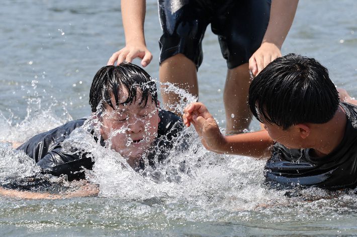 전국 곳곳 폭염주의보가 발효된 19일 오후 서울 여의도물빛광장을 찾은 중학생들이 물놀이를 즐기고 있다. 연합뉴스 |