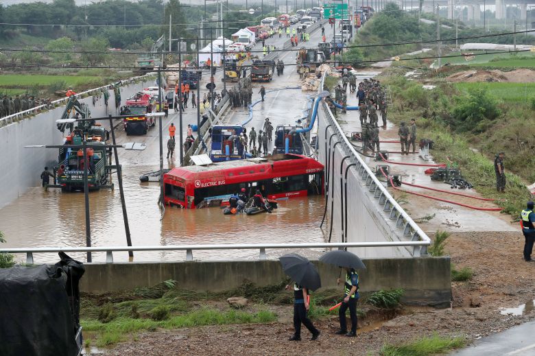 16일 미호천 제방 유실로 침수된 충북 청주시 오송읍 궁평2지하차도에서 군과 소방당국이 구조작업을 하고 있다. /뉴스1 |