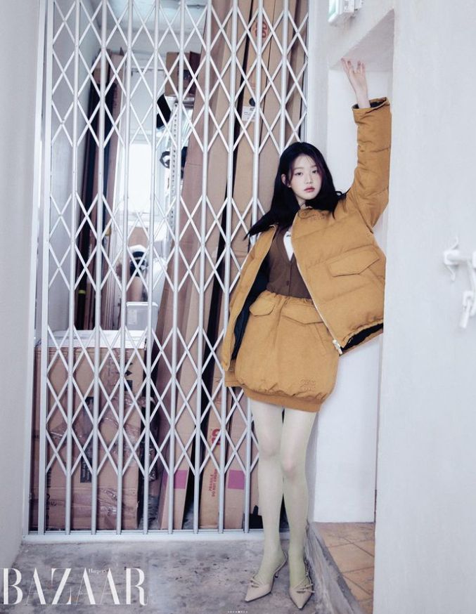 뿔테안경을 쓰고 가방을 든 포즈나 카멜 색 숏 패딩재킷에 패딩 치마를 입은 모습 등이 더없이 사랑스럽다.