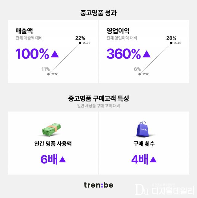 중고 명품에 힘쓰는 트렌비 성과는 의외로 빠르게 나타나고 있다. 트렌비 중고 명품 매출이 전체 매출에서 차지하는 비중은 작년 6월 11%에서 올해 6월 22%로, 중고 명품으로 인한 영업이익은 전체 영업이익 대비 같은 기간 6%에서 28%로 1년간 360% 상승했다. 중고명품 사업으로 영업이익 절반을 차지하는 목표도 세웠다.