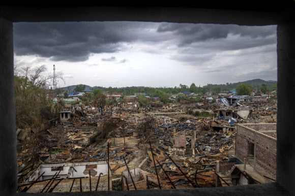 인도 북동부 마니푸르주에서 힌두교를 믿는 메이테이 부족과 기독교를 신봉하는 쿠키 부족의 유혈 충돌이 두 달가량 이어지는 가운데 젊은 남성들이 두 모녀를 알몸으로 끌고 다니며 집단 성폭행하는 동영상이 19일(현지시간) 소셜미디어(SNS)에 나돌아 인도 전역이 분노로 들끓고 있다. 사진은 지난달 21일 수그누란 마을의 집들이 불에 타버린 모습. AP 자료사진 연합뉴스 |