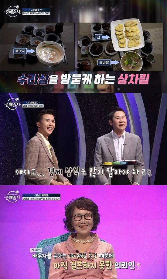 현대사회에서 다소 자극적인 단어들이 등장한 가운데 노정 그린 중매술사는 "의뢰인의 경제적 여건이 충족돼 내조를 원하는 것도 합리적인 선택"이라고 말했으며 네 명의 중매술사들이 엄선해온 프리랜서 아나운서, 필라테스 강사, 프리랜서 쇼호스트, 프로골퍼 겸 골프 아카데미 CEO가 출연해 의뢰인이 제시한 조건에 부합하는지 검증하는 시간을 가졌다.