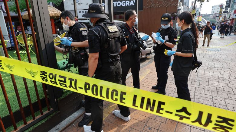 21일 오후 서울 지하철 2호선 신림역 4번 출구 인근 거리에 폴리스라인이 쳐져 있다. 이날 오후 2시쯤 30대 남성이 길 가는 사람들에게 마구잡이로 흉기를 휘둘러 1명이 숨지고 3명이 다쳐 병원으로 옮겨졌다. /연합뉴스 |
