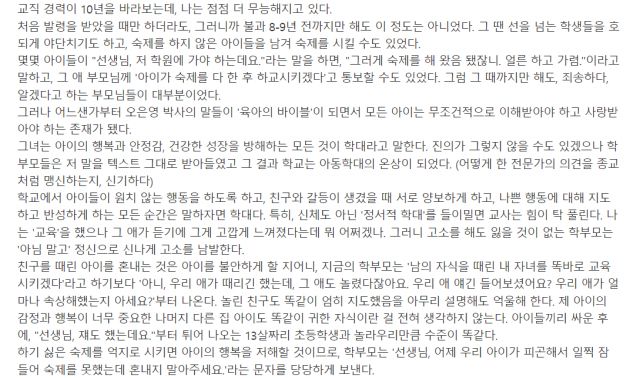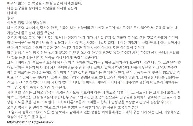 글쓴이 A씨는 “교직 경력이 10년을 바라보는데 나는 점점 더 무능해지고 있다”며 말문을 열었다. 그는 “어느샌가부터 오은영 박사의 말들이 '육아의 바이블'이 되면서 모든 아이는 무조건적으로 이해받아야 하고 사랑받아야 하는 존재가 됐다”고 말하며 “오 박사는 아이의 행복과 안정감, 건강한 성장을 방해하는 모든 것이 학대라고 말한다. 진의가 그렇지 않을 수도 있겠으나 학부모들은 저 말을 텍스트 그대로 받아들였고 그 결과 학교는 아동학대의 온상이 되었다. 어떻게 한 전문가의 의견을 종교처럼 맹신하는지. 신기하다”고 했다.