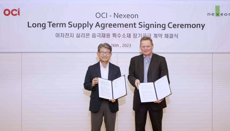 OCI는 이날 영국 넥세온(Nexeon)사와 이차전지용 실리콘 음극재 생산에 필요한 핵심 원재료의 장기 공급 계약을 체결했다고 발표했다.