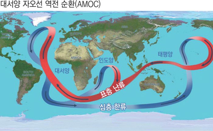 국제 학술지인 네이처 커뮤니케이션즈는 26일(현지시간) 덴마크 코펜하겐대 페테르·수잔네 디틀레우센 교수 연구팀이 1870~2020년 북대서양 해수면 온도와 해류 흐름을 관측한 결과 ‘대서양 자오선 역전 순환(AMOC)’이 2095년 이전에 완전히 사라질 수 있다고 결론 내린 논문을 게재했다.