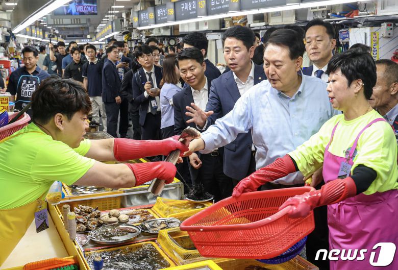 윤 대통령은 1층 상회에 들러 "제철 수산물이 어떤 것이 있는지", "가격은 얼마인지", "여름 비수기라 손님이 줄어든 것은 아닌지" 등을 꼼꼼히 물으며 일본 후쿠시마 오염수 방류 논란으로 위축된 시장 상황을 직접 챙겼다.