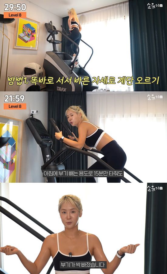 그는 일명 '천국의 계단'이라고 불리는 스텝밀을 하면서 팁을 전할 것이라고 했다. 소유는 "저는 레벨8로해서 그냥 탄다. 기구마다 난이도가 다르다. 정확한 자세가 필요하다"며 레벨 8로 맞춘 후 30분간 운동을 예고했다.