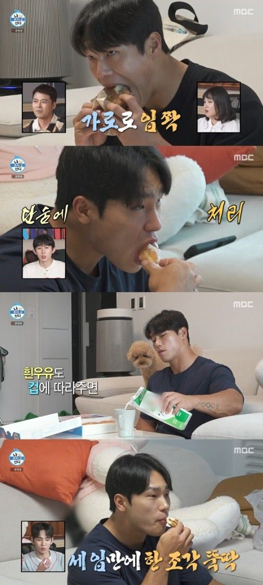 햄버거 두 개를 먹은 윤성빈은 6개 짜리 도넛 두 박스를 먹기 시작했다. 우유와 함께 도넛을 한입에 밀어넣은 윤성빈은 “도넛이 원래도 입에 들어가면 녹아 없어진다. 그런데 우유를 같이 먹으면 진짜 녹아서 없어진다”라며 행복한 모습을 보였다.