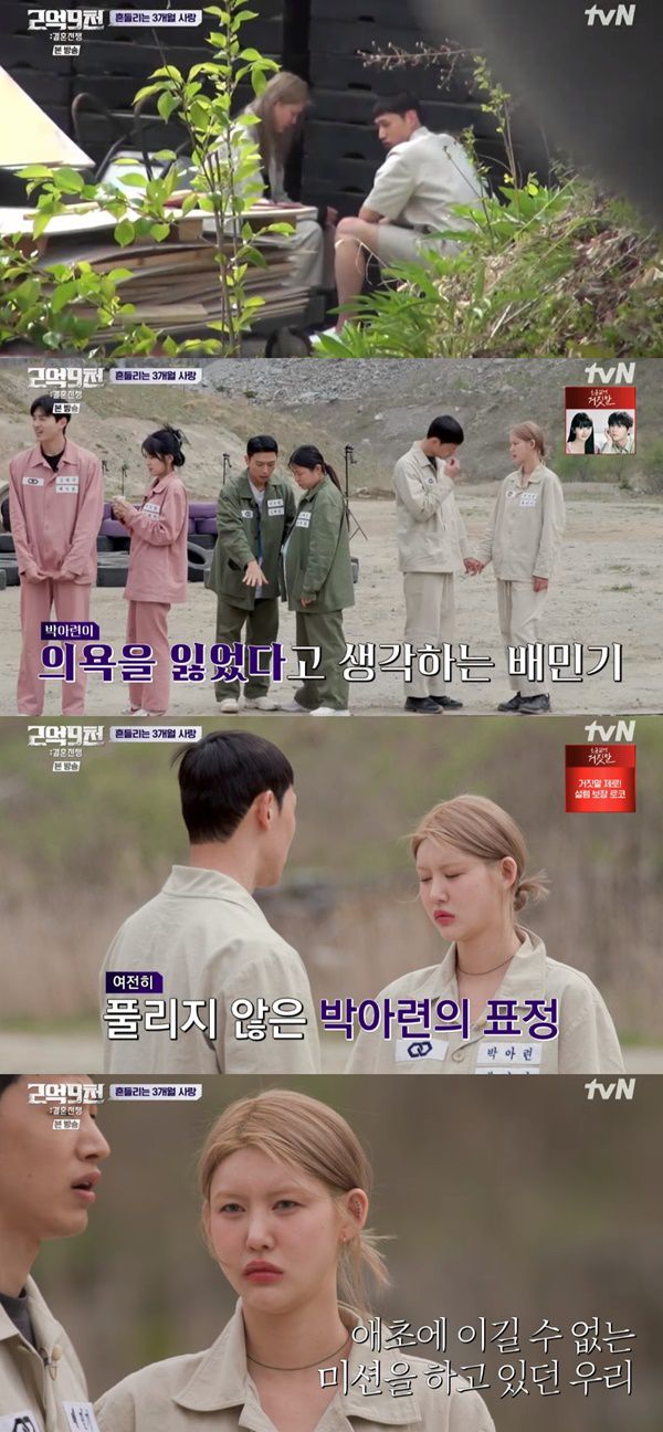 박아련은 미션이 끝나고 표정이 어두웠다. 배민기가 이유를 물었지만 답하지 않았다. 박아련은 배민기에게 서운한 마음을 느꼈고 그 기분이 풀리지 않는 모습.
