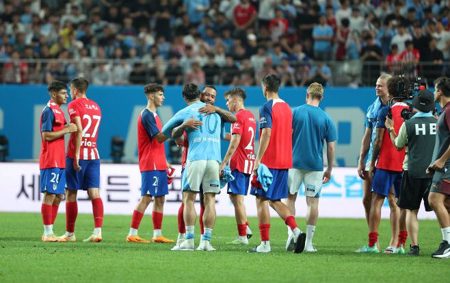0일 서울월드컵경기장에서 열린 쿠팡플레이 시리즈 2차전 AT마드리드와 맨체스터 시티의 경기가 끝난 뒤 양팀 선수들이 인사를 하고 있다. /연합뉴스 |
