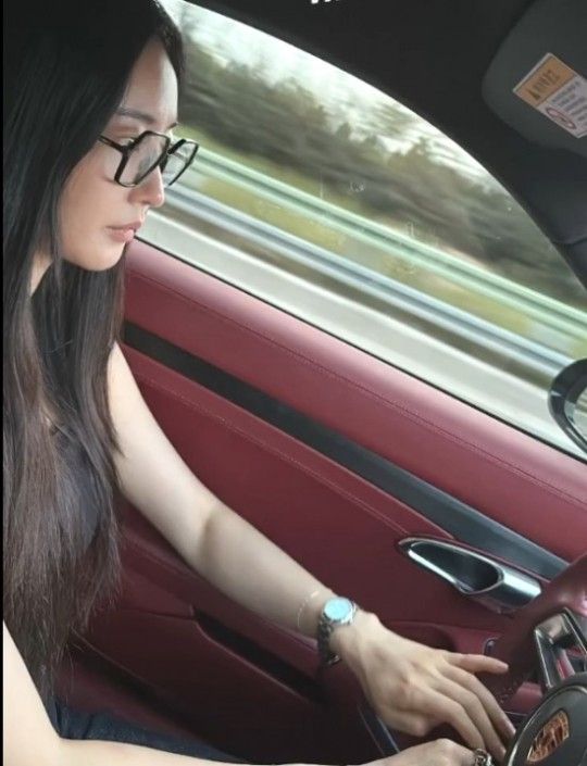 공개된 사진 속 김사랑은 인테리어가 빨간색으로 장식된 포르셰 차량을 직접 운전하고 있다.