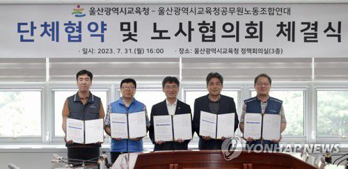 (울산=연합뉴스) 김용태 기자 = 울산시교육청은 지방공무원노동조합연대와 31일 단체 협약을 체결했다고 밝혔다.