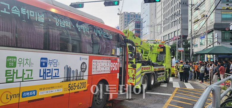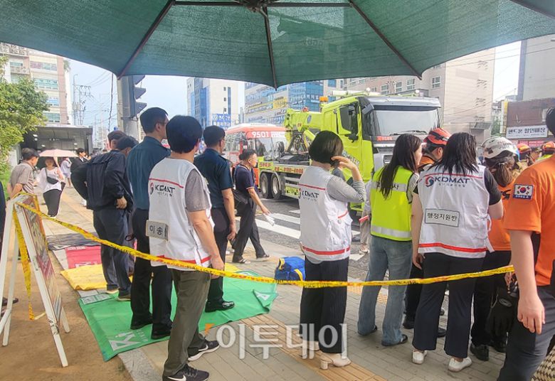 31일 경기도 김포시 고촌역 1번 출구 앞에 대형교통사고가 발생해 소방 관계자들이 사고를 수습하고 있다. 김포시청은 안전 안내 문자를 통해 '골드라인 고촌역(시청방향) 1번출구 인근 통행이 매우 어려우니 우회 및 안전운전을 해야한다'고 당부했다.
