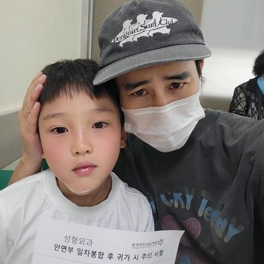 함께 공개한 사진에는 정태우의 아들 하린 군이 턱이 찢어져 안면부 일차봉합술을 받은 모습이 담겼다.
