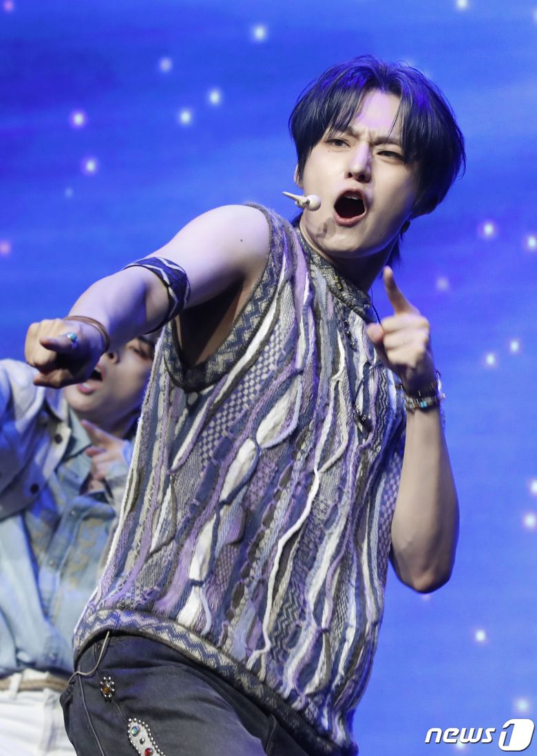 (서울=뉴스1) 권현진 기자 = 그룹 씨드(XEED)의 바오가 1일 서울 용산구 대원콘텐츠라이브에서 가진 두 번째 미니 앨범 '블루(BLUE)' 발매 쇼케이스에서 신곡을 선보이고 있다. 2023.8.1/뉴스1