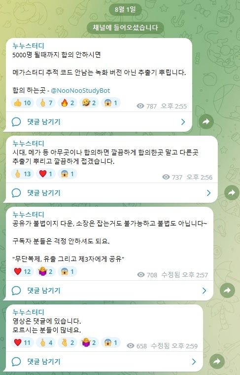 1일 인터넷강의(이하 인강) 영상을 불법으로 유포하고 있는 텔레그램 채널 ‘누누스터디’의 운영자가 시대인재, 메가스터디를 대상으로 협박을 일삼고 있다. 자신과 합의하지 않으면 인강 영상을 추출할 수 있는 프로그램을 유포하겠다는 내용이다.