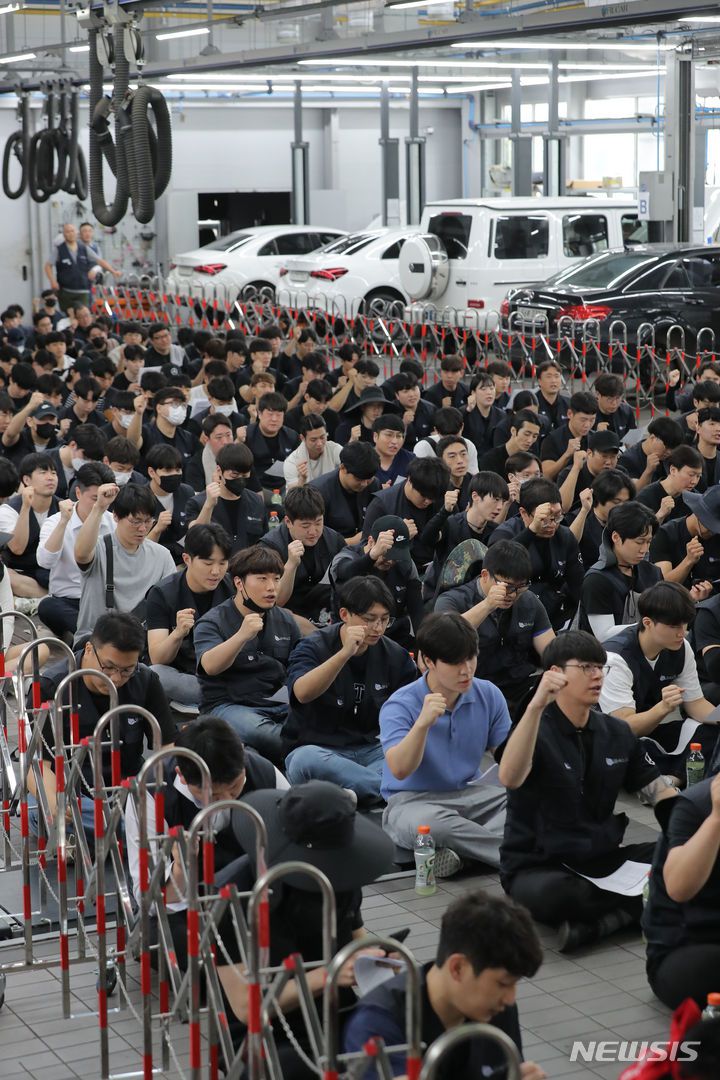 [인천=뉴시스] 김금보 기자 = 금속노조 수입자동차지회 한성자동차 노조 조합원들이 2일 오후 인천 중구 한성자동차 메르세데스벤츠 인천서비스센터에서 임금인상과 처우개선을 촉구하는 파업 집회를 하고 있다. 2023.08.02. kgb@newsis.com