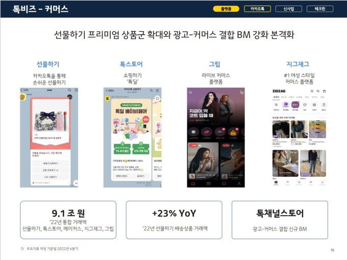 또 카카오톡으로 쇼핑할 수 있는 '톡스토어', 라이브 커머스 플랫폼인 '그립', 여성스타일 커머스 플랫폼인 '지그재그' 등 다양한 수익모델을 만들어 내고 있다. 카카오의 '유료 이모티콘'과 '카카오 프렌즈'의 '굿즈' 사업도 사용자들에게 높은 인기를 얻고 있다.