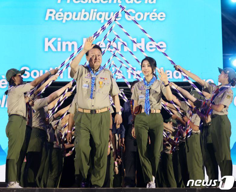 스카우트 복장 차림의 윤 대통령과 부인 김건희 여사는 이날 오후 전라북도 부안군 새만금에서 열린 '2023 새만금 제25회 세계스카우트잼버리'(세계잼버리) 개영식에 참석했다.
