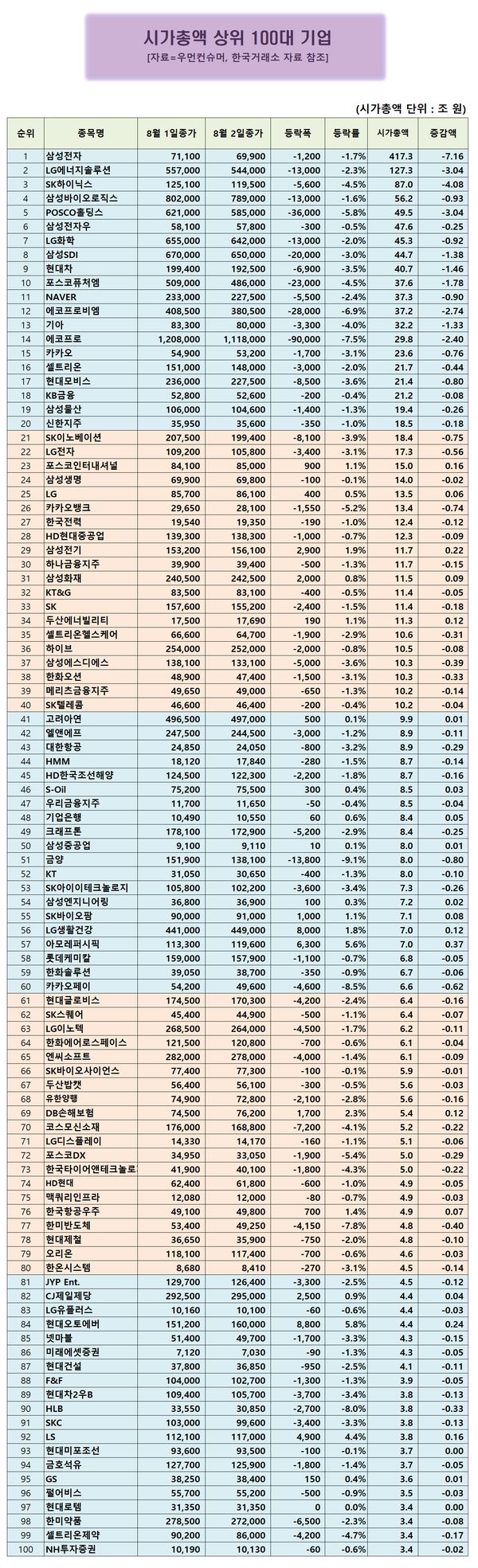 1위 삼성전자 6만9900원 -1200원(-1.69%), 2위 LG에너지솔루션 54만4000원 -1만3000원(-2.33%), 3위 SK하이닉스 11만9500원 -5600원(-4.48%), 4위 삼성바이오로직스 78만9000원 -1만3000원(-1.62%), 5위 POSCO홀딩스 58만5000원 -3만6000원(-5.8%), 6위 삼성전자우 5만7800원 -300원(-0.52%), 7위 LG화학 64만2000원 -1만3000원(-1.98%), 8위 삼성SDI 65만원 -2만원(-2.99%), 9위 현대차 19만2500원 -6900원(-3.46%), 10위 포스코퓨처엠 48만6000원 -2만3000원(-4.52%),