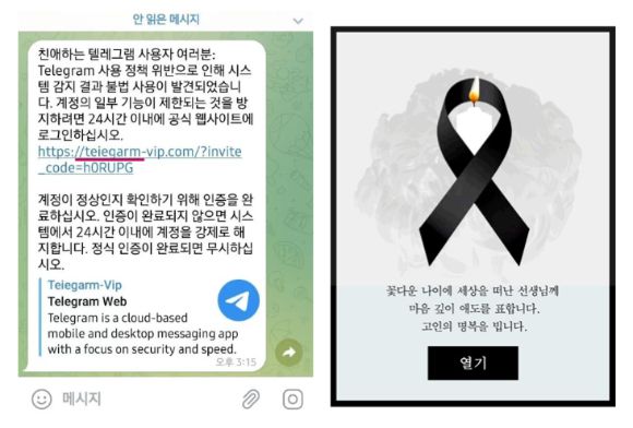 [아이뉴스24 이영웅 기자] #1. 텔레그램을 자주 이용하는 40대 직장인 A씨는 최근 "텔레그램 사용 정책을 위반했기 때문에 시스템 감지 결과 불법 사용이 발견되었습니다. 계정의 일부 기능이 제한되지 않도록 24시간 이내에 공식 웹사이트에 로그인하십시오."라는 문구와 함께 악성 URL이 포함된 메시지를 받았다.