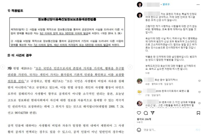 저는 표현의 자유는 폭넓게 인정되어야 한다고 생각하고, 저에 대한 인터넷 게시글 등은 크게 신경 쓰지 않습니다.