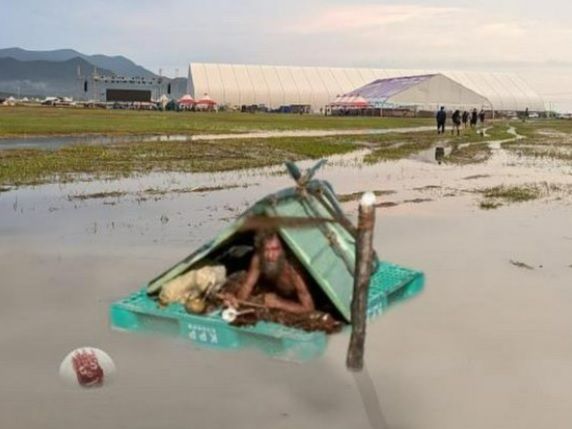 한 해외 네티즌은 영화 '캐스트 어웨이' 주인공이 바다가 아닌 잼버리 야영장에서 표류하는 합성 이미지(위)를 게시했다. 제대로 된 배수 시설 미흡으로 물바다가 돼버린 잼버리 부지에 텐트를 쳐야 하는 상황을 풍자한 것이다.