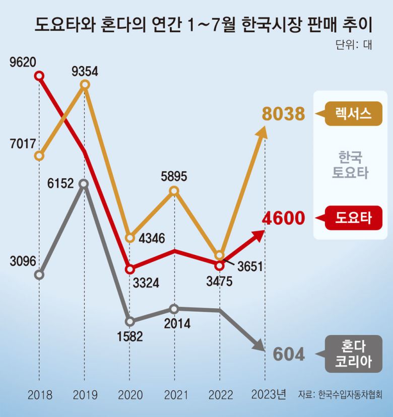 6일 한국수입자동차협회에 따르면 한국토요타는 올 1∼7월 한국 내수 시장에서 대중 브랜드인 ‘도요타’(4600대)와 고급 브랜드인 ‘렉서스’(8038대)를 합쳐 1만2638대를 판매했다. 지난해 같은 기간 7126대를 판 것과 비교해 1년 새 77.4% 늘었다. 특히 2019년 한일 무역분쟁이 촉발한 일본 상품 불매운동이 벌어진 이후 판매량이 급감했던 렉서스는 올해 1∼7월 8038대를 판매하며 반등에 성공한 모양새다. 렉서스는 2018년 같은 기간 7017대를 팔았는데 이를 훌쩍 뛰어넘은 것이다.