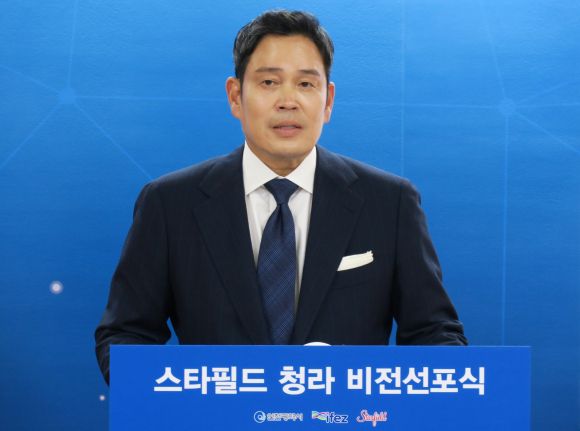 16일 오후 인천 남동구 인천시청에서 정용진 신세계그룹 부회장이 스타필드청라 사업계획 브리핑 및 멀티스타디움 건립 비전 선포식에 참석해 축사를 하고 있다. 2023.6.16 뉴시스 |
